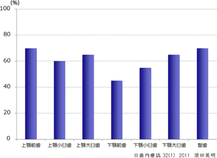 「神経を抜きましょう」という言葉で知られている根管治療は、歯科医療の中でも繊細で高度な技術を要求される治療の一つです。保険診療では少ない自己負担で治療できる反面、再発する可能性が高いのも事実です。下の表は、根管治療後のレントゲンで歯の根に病巣を確認できた割合をグラフにしたものです。平たく言えば、再治療率 (失敗率) をグラフにしたものです。
